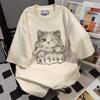 Cotton Niche Design Cat Print Summer Short-sleeved T-shirt Women's Loose Round Neck Trendy Couple American Top