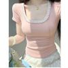 Secret Jam Women's Solid Color Lace Retro Sweet Square Neck T-shirt