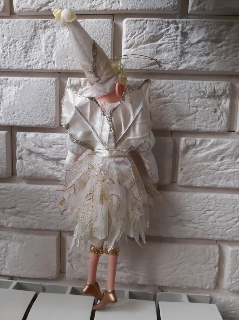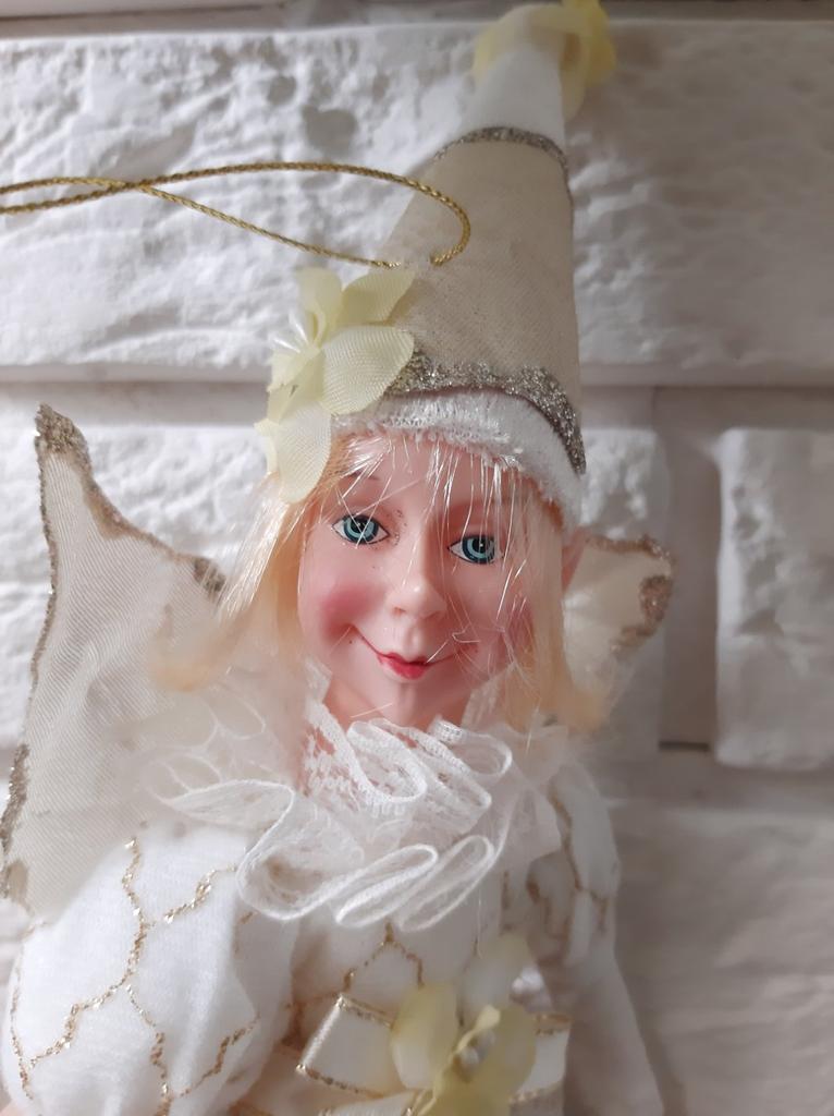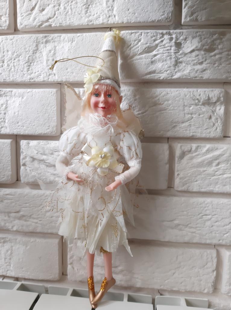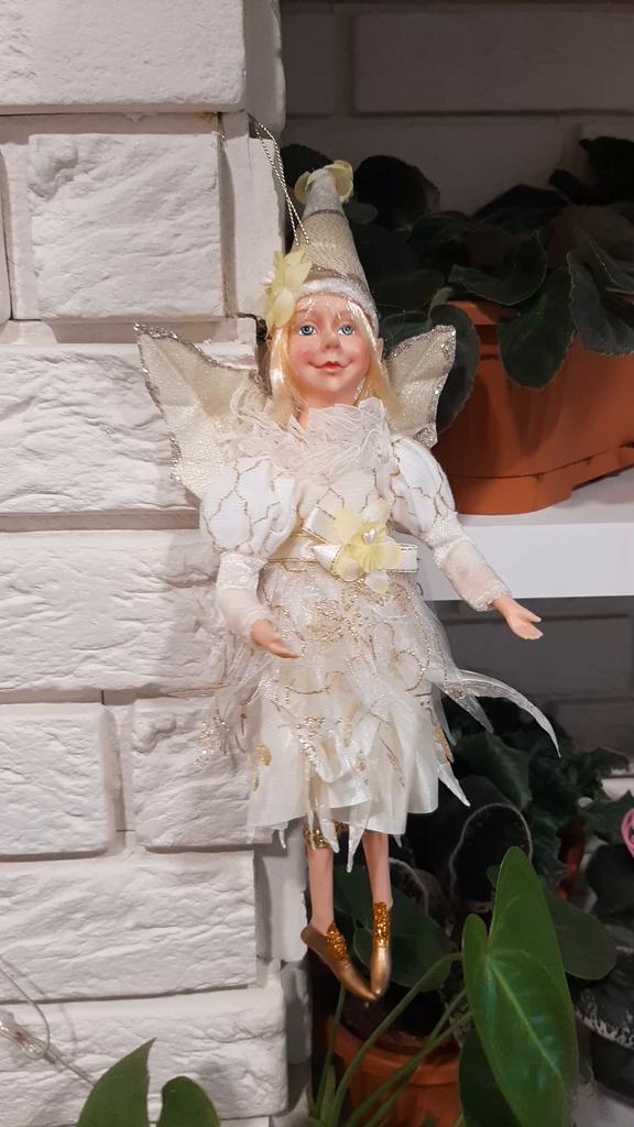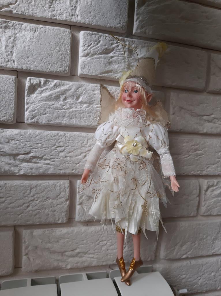 Veldig søt alv..håndtakene er bøyde..beina er ikke stabile fordi den er designet for å henge..den ser mindre ut på bildet.faktisk 35cm.Fargen er litt lysere enn på bildet.