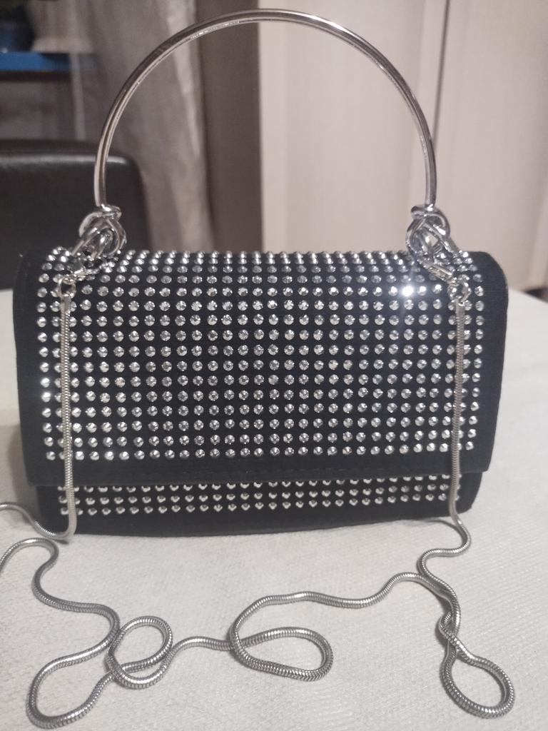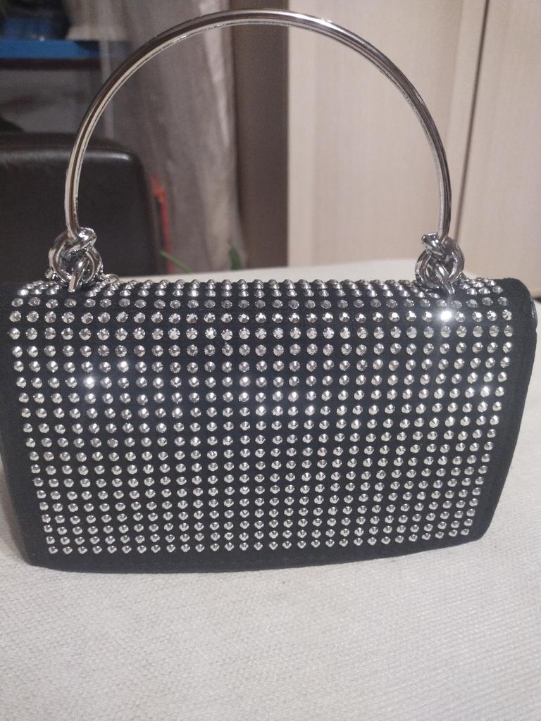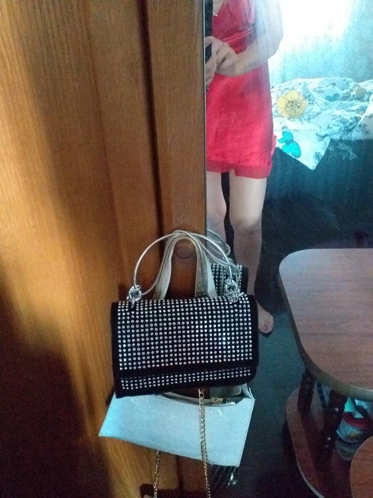 Vesken er veldig vakker, fargen er svart, skinnende, det er et håndtak og en kjede, en lås med 2 knapper, takk for slik skjønnhet.
