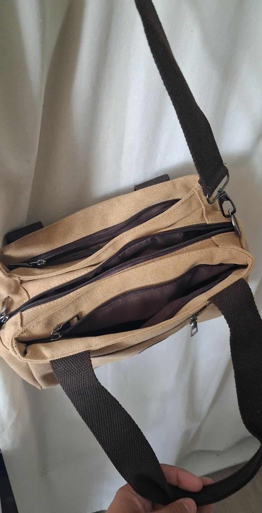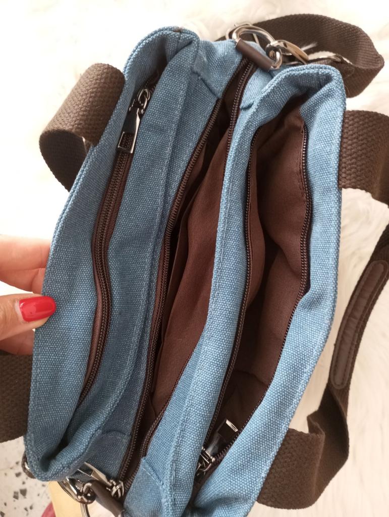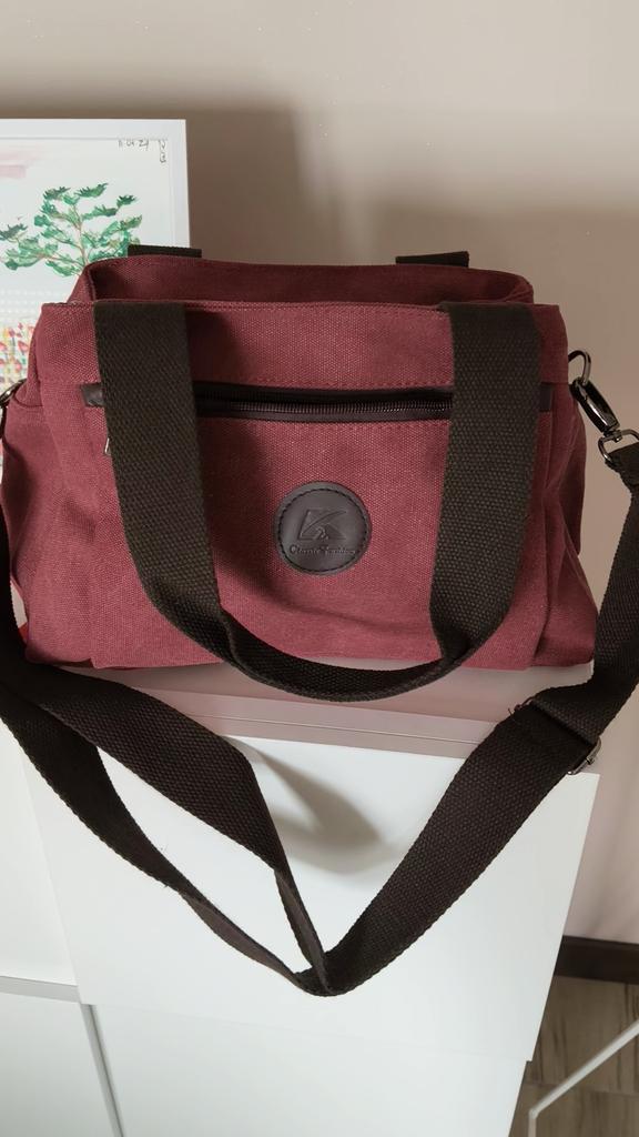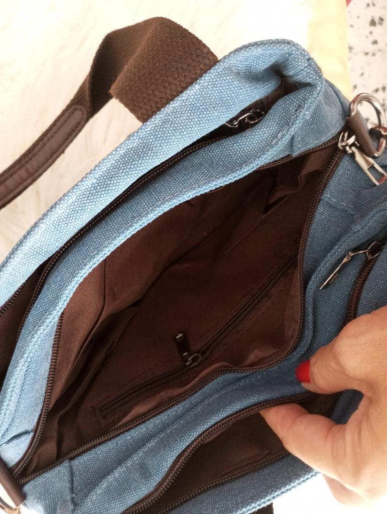 LERRETSVESKE veske i lerretstype Canvas, kan bæres i hånden og over skulderen. Stoffet er av utmerket tykkelse, helt sikkert veldig slitesterkt spesielt for daglig bruk. Skulderstroppen er avtakbar og utstyrt med praktiske karabinkroker, Vesken har hele tre rom med glidelås, hvert rom har innerlommer, glidelåsene fungerer perfekt. Tilgjengelig i 5 farger, Materiale: stoff. Sømmene er pene, ingen vond lukt, ingen feil funnet. Ankommet i Italia på 18 dager med sporet forsendelse. Emballasje: cellofanfolie. En veske av utmerket kvalitet til en utmerket pris. Superanbefalt kjøp 👍