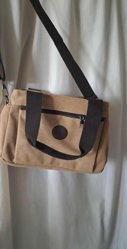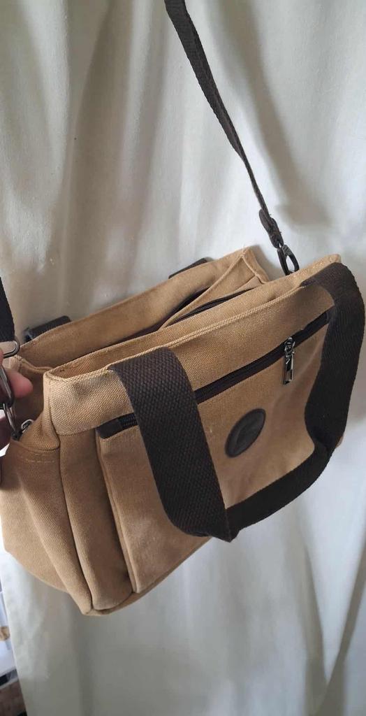 ✨ Skulderveske i lerret Farge Khaki Denne praktiske og elegante vesken er designet i slitesterkt beige lerret, med håndtak og skulderreim i robust svart webbing. Det kompakte formatet gjør den til en ideell følgesvenn for hverdagsbruk: romslig nok til å romme dine nødvendigheter, samtidig som den er lett og enkel å bære.. ✔️ Detaljer : Måler 32×22 cm Materiale: tykt og slitesterkt lerret Farge: beige med svarte detaljer Glidelås på frontlommen for rask tilgang Doble håndtak for bæring i hånden + justerbar skulderreim for bæring over skulderen eller på tvers Rund logo sydd på forsiden for et sobert og moderne preg 📌 Bruk: perfekt for daglige utflukter, jobb, studier eller lette reiser. ✅️ Den fantastiske kvaliteten ✅️Jeg anbefaler denne selgeren på det sterkeste