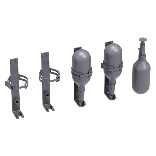- Two types of holders are reproduced, each with a fire extinguisher bottle attached and two with just the holder, a total of 8 pieces.