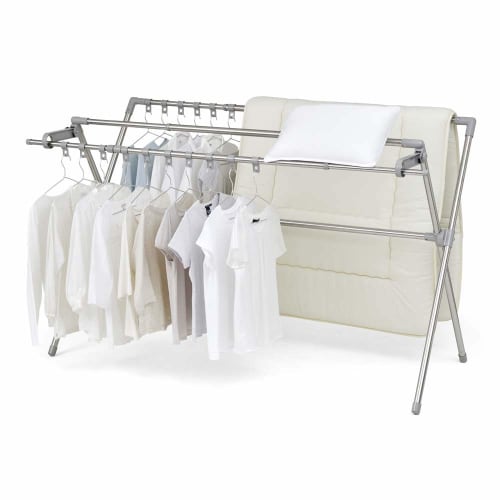 Excellent ventilation with double bars and hangers. A futon dryer that is stretchable and can be dried thoroughly. Large capacity that allows you to dry clothes and futons all at once. You can dry 4 futons. Point.1 The double bar makes your futon fluffy. It creates an air passage, so it dries fluffy in a short time! You can also dry pillows and stuffed animals on the double bar! By hanging the clothes on hangers alternately, you can dry them in a small amount of space. Point 2: A mobile hanger that keeps your laundry from shifting Even when the wind blows, it doesn't shift, so there's no need to secure your laundry. You can freely adjust the spacing between the hangers for excellent ventilation! The hanger can be attached or removed freely. It is OK to use it in two stages! Point.3 The width can be expanded and contracted according to the amount of laundry.The clothesline itself and the rod can be expanded and contracted individually. If you want to dry a lot, you can extend it to the maximum and dry plenty of clothes and towels. Saves space when the amount of laundry is small. It is also convenient for drying futons for one person. [Many other things! Special points: The double bar is at a height that makes it easy to hang the futon. The rounded corner frame makes it easy to hang the futon. The height makes it difficult to see from outside even when placed on the balcony. When folded, it becomes much more compact. The pipe has a stainless steel finish and is easy to clean. It can also be used outdoors. [Easy assembly with no tools required] Just insert the pipe into the frame until you hear a click. ★Customer assembly★