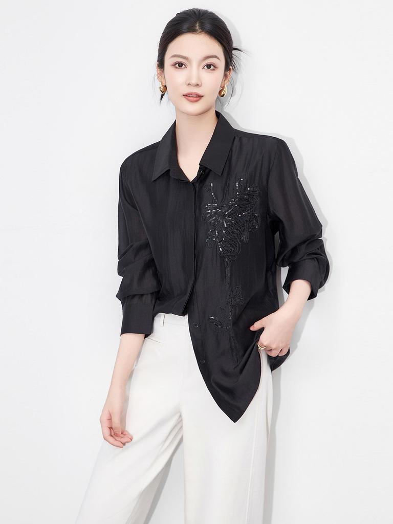 Elevate your early autumn wardrobe with this exquisite long sleeve shirt, crafted from a luxurious Tencel blended material that offers comfort and breathability. The shirt features a sophisticated solid pattern with a loose fit, making it both stylish and versatile for any occasion. Its standout feature is the elegant embroidery that adds a touch of finesse. The turn-down collar and tailor neckline blend seamlessly for a polished look, making it a perfect addition to any woman's fashion collection.