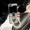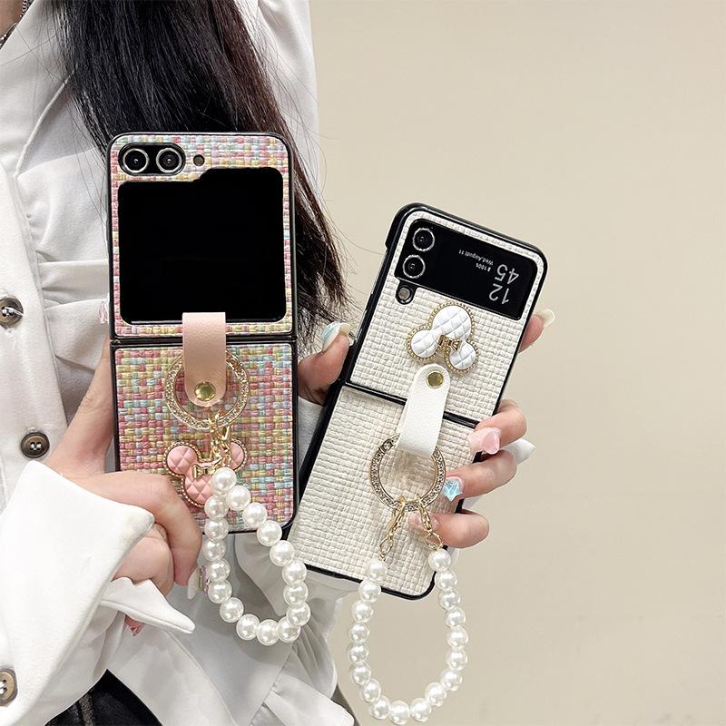 Woven Pattern Flip Phone Case for Samsung Zflip5 Folding Screen Pearl Hand Chain Xflip Rhinestone 4 Ring