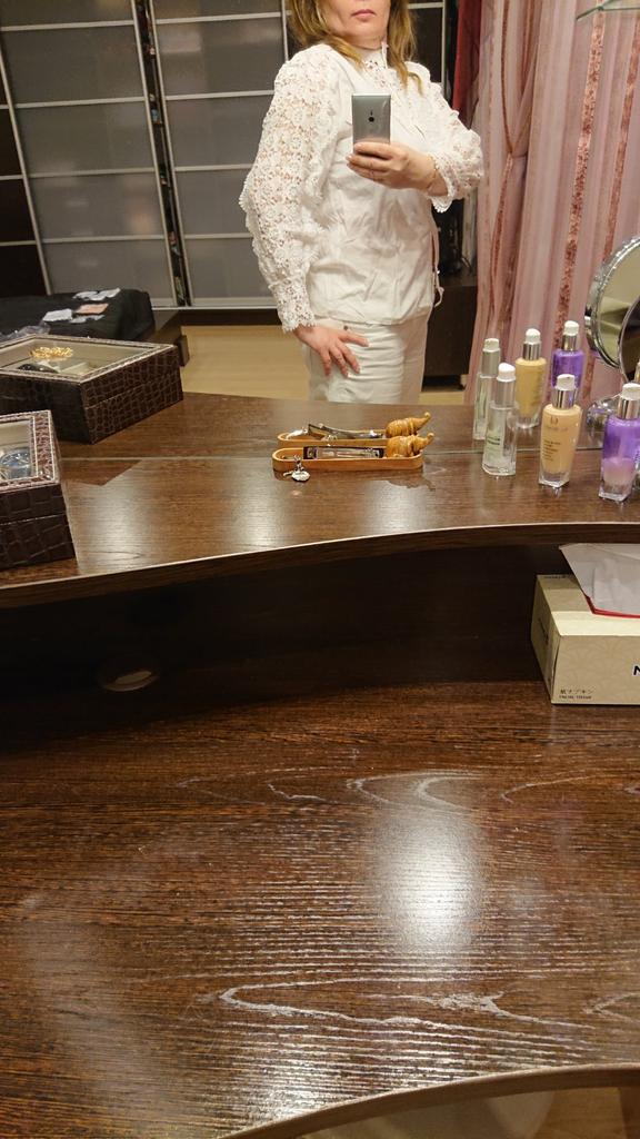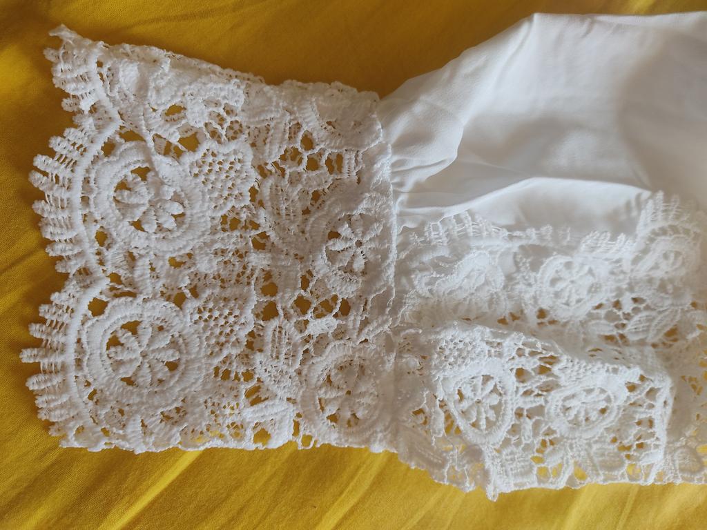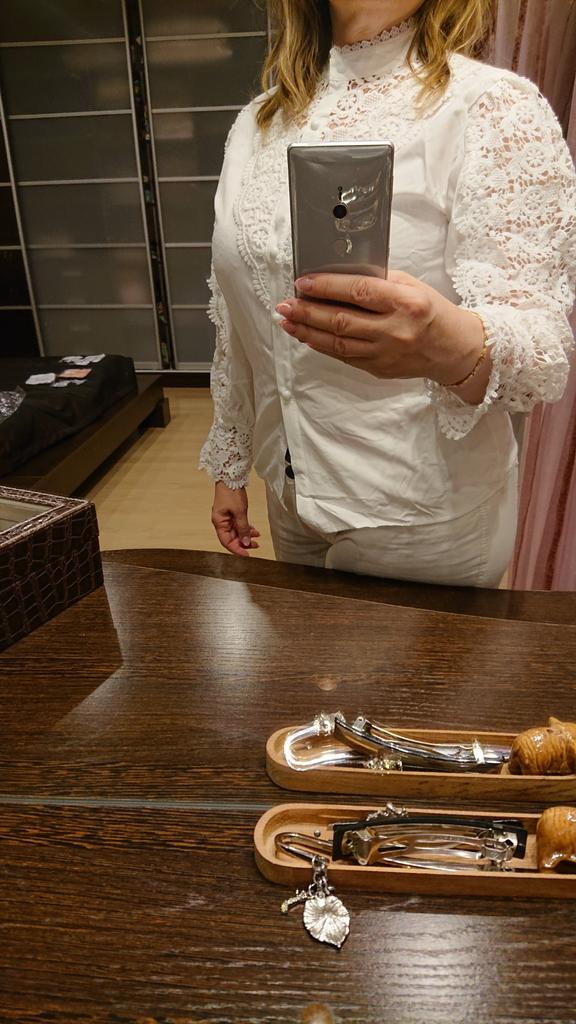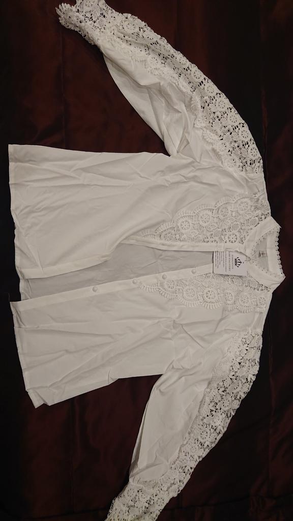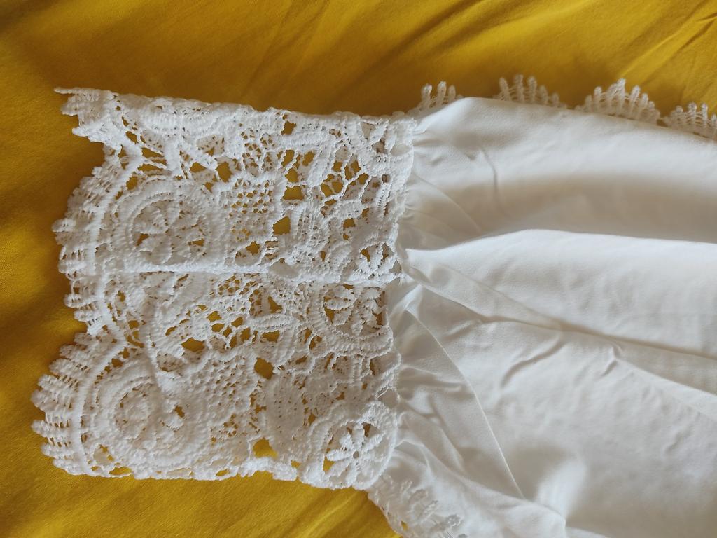 Красивая белоснежная блузка. В размере Lна мои 170/88-66-90/52 кг, комфортно, пошив тоже фабричный, состава нет, по составу напоминает плотный и не прозрачный шёлк, приятная к телу, текстура ткани гладкая и не жаркая, х/б не присутствует. Очень нарядная, ворот- свободная, застёжка на планке с мелкими круглыми пуговицами, рукав пышный с кружевом плотным и красивым, типа вязки крючком. Не светится, не мнётся, не электрезуется. Плечи-38, длинна рукава:48см+12см. длинна блузки: 58см. Прекрасная блузка, я очень довольная.Рекомендую на 100% Спасибо огромное Джум 🌟🌟🌟🌟🌟🖐🏼