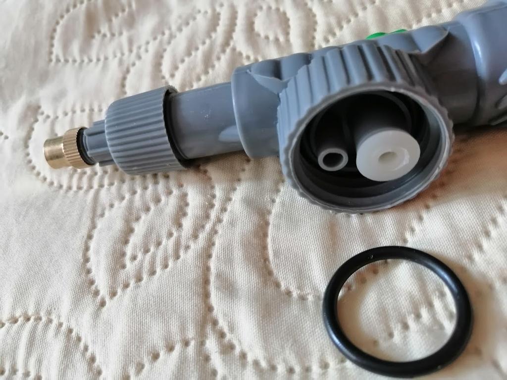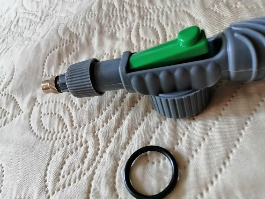 Придбала це до того, як цей товар почав продаватись у нас. Запаковано було в простий пакет, але все ціле, працює. Є запасне ущільнюване кільце. Розприскує як на картинці. Якщо покрутити форсунку, то можна отримати струю.